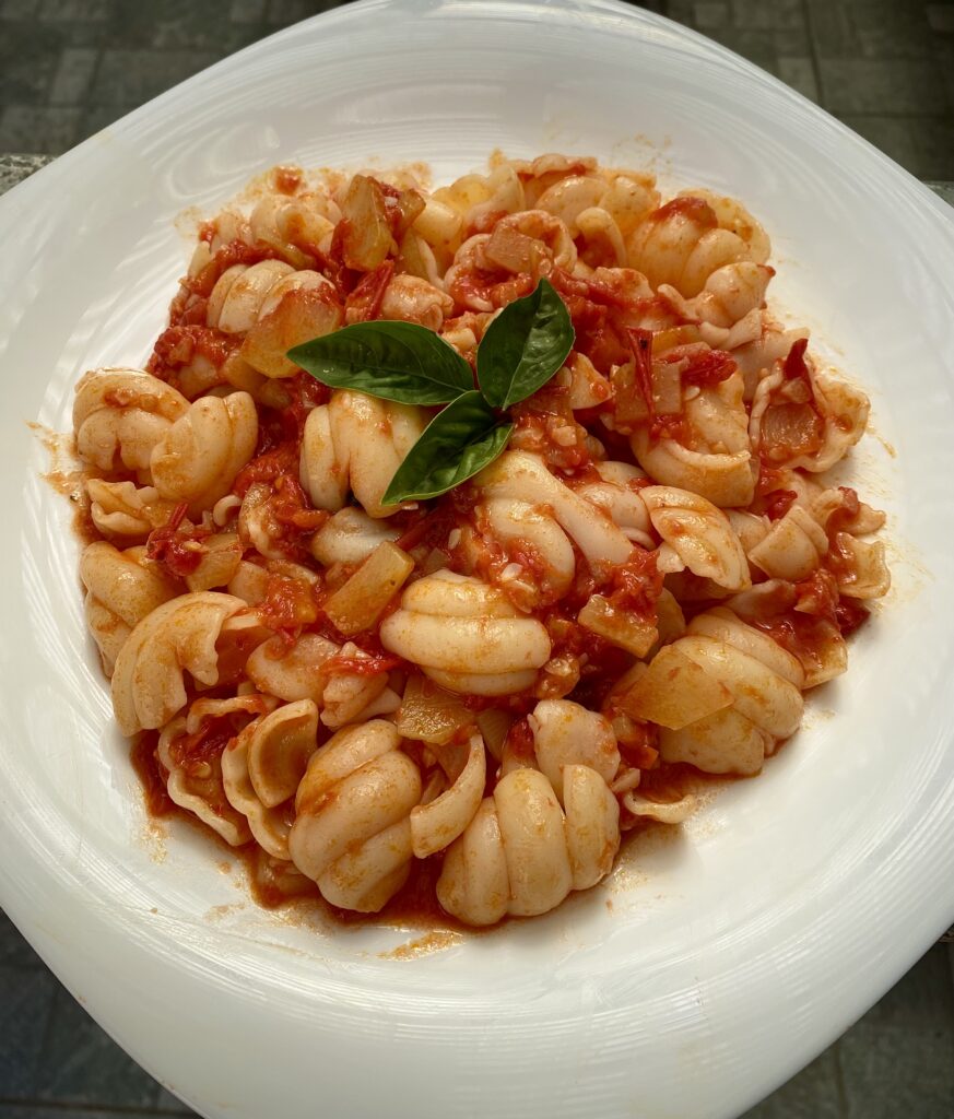 Preparare: se fierb pastele, se strecoară şi se pun într-un bol. Restul ingredientelor se pun într-o cratiţă şi se fierb la foc potrivit pentru 10 min. . Se toarnă sosul obţinut peste pastele făinoase. Se serveşte fierbinte!